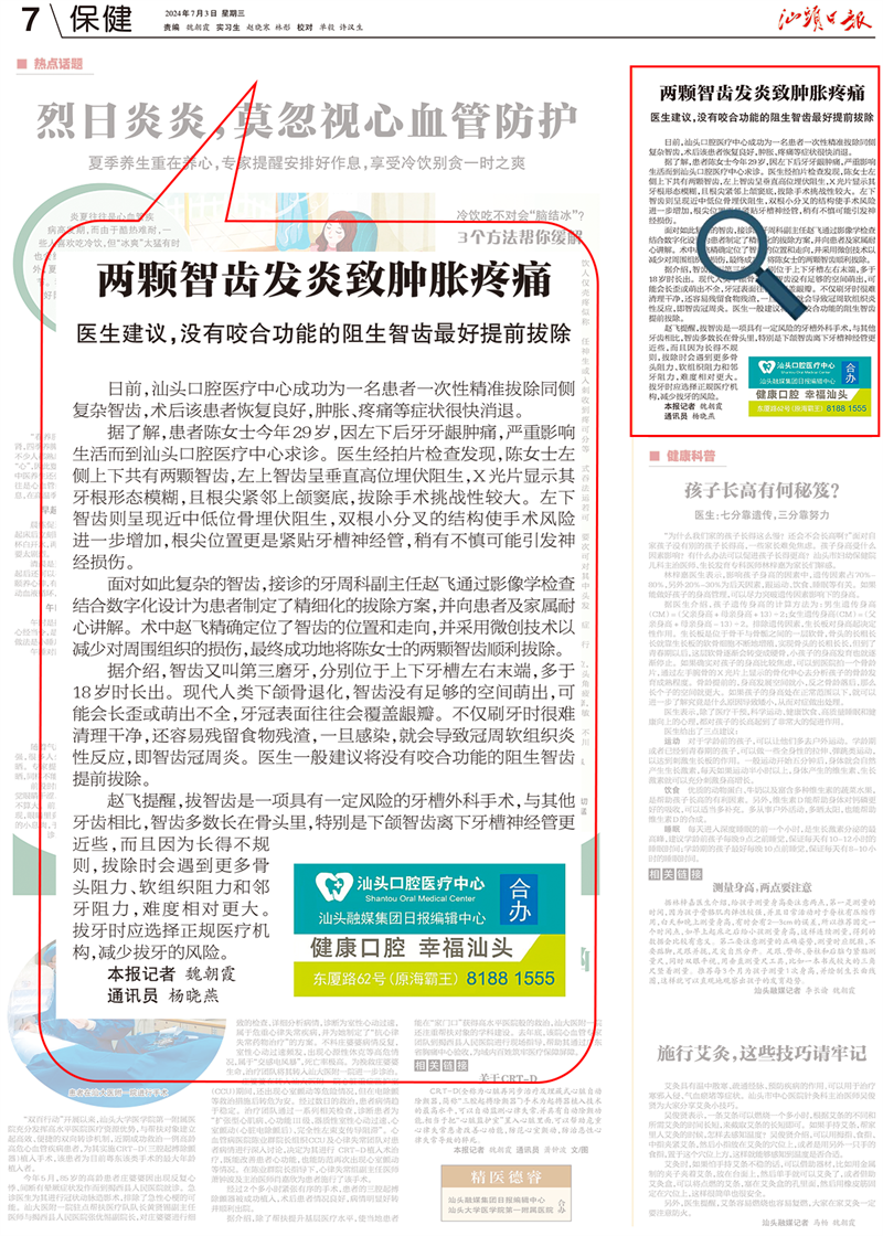 汕頭日?qǐng)?bào) | 兩顆智齒發(fā)炎致腫脹疼痛 醫(yī)生建議,沒(méi)有咬合功能的阻生智齒最好提前拔除