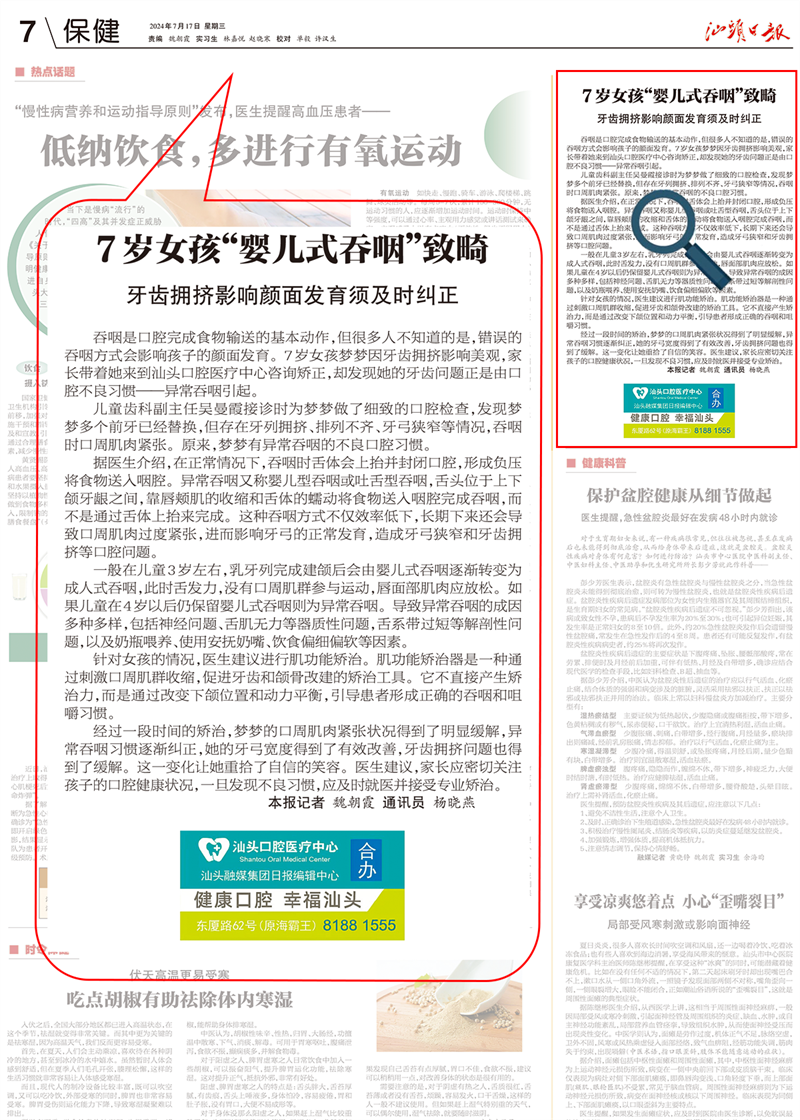 汕頭日報 | 7歲女孩“嬰兒式吞咽”致畸 牙齒擁擠影響顏面發(fā)育須及時糾正