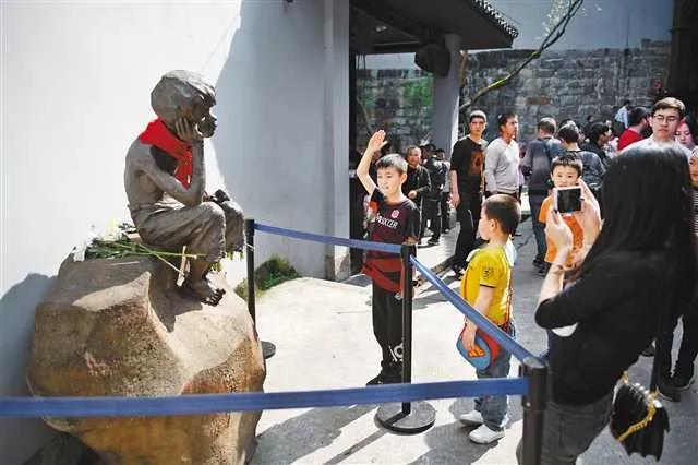白公館景區(qū),一名孩子向小蘿卜頭雕像敬禮。首席記者 謝智強(qiáng) 攝 圖:新華網(wǎng)