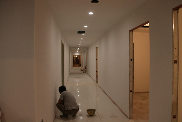 目前三樓正在進(jìn)行大面積的墻面及地面粉刷,補縫、刷白等工序在有條不紊地進(jìn)行當(dāng)中。