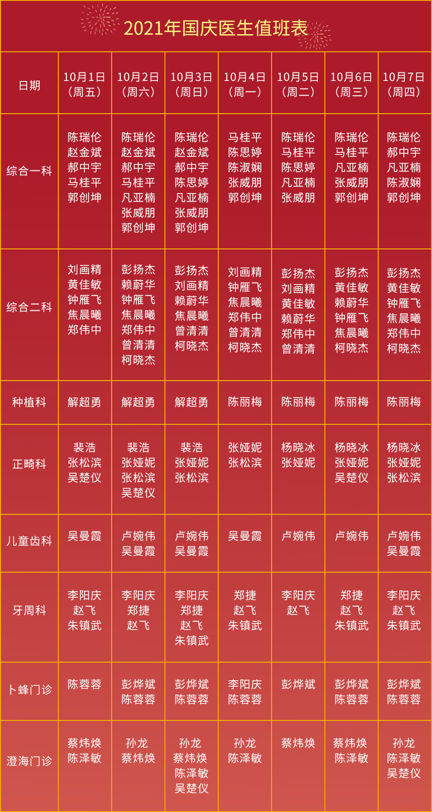根據(jù)國(guó)務(wù)院辦公廳通知,2021年國(guó)慶節(jié)放假時(shí)間為10月1日至10月7日,共7天。為方便廣大汕頭市民朋友假日期間就醫(yī),汕頭口腔醫(yī)療中心實(shí)行“無(wú)假日醫(yī)院制度”,節(jié)假日我院本部、澄海門(mén)診部、卜蜂中心門(mén)診部均正常接診,各種檢查正常開(kāi)展。