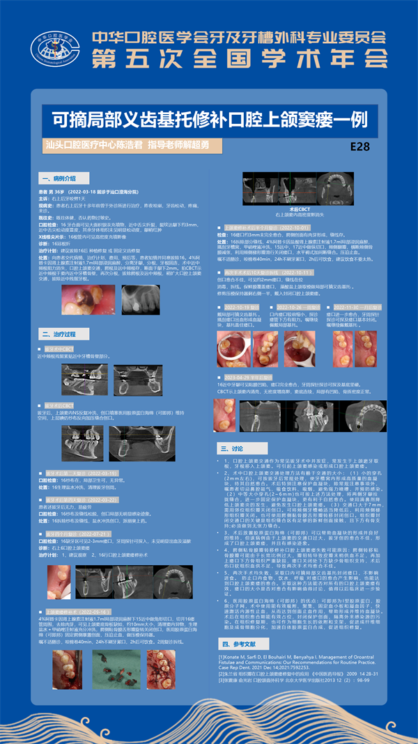 會(huì)議涵蓋了主題演講、青年病例報(bào)告會(huì)等活動(dòng),并進(jìn)行壁報(bào)展示。我院種植科陳浩君醫(yī)生投稿的病例《可摘局部基托修補(bǔ)口腔上頜竇瘺一例》入選了壁報(bào)展示。