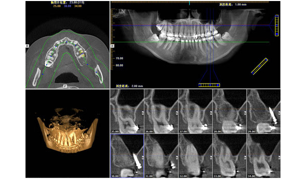 口腔種植科是_先應用CBCT并且是應用_多的口腔臨床科室之一。CBCT能為口腔種植提供精確的三維影像,可以很好的顯示頜骨的骨質(zhì)、骨量及下頜神經(jīng)管、上頜竇等組織結(jié)構(gòu)。當前CBCT結(jié)合第三方軟件Simplant進行種植手術(shù),CBCT掃描后數(shù)據(jù)輸入Simplant后進行模擬種植,建立可視化三維模型,并在其上設計_佳手術(shù)方案,制作種植手術(shù)導板,將種植體的理想位置轉(zhuǎn)移至患者頜骨內(nèi),大大降低了種植手術(shù)風險。