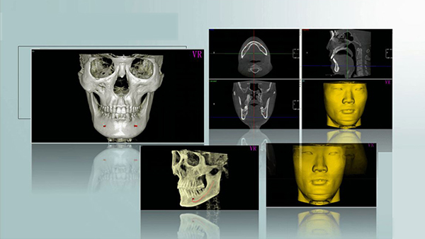 一次CBCT掃描成像即可同時獲得顱頜面、牙周、顳下頜關節(jié)、牙齒等多個組織器官的三維 結(jié)構(gòu)信息,而不需通過全景片,頭顱正側(cè)位片多次成像進行分析診斷。CBCT圖像具較好的準確性,提高了對組織不對稱性的定位、識別和量化,在顯示氣道異常、評估牙周情況、確認牙齒齲壞和根管問題,顯示髁突位置及顳下頜骨性結(jié)構(gòu)、查看埋伏牙,多生牙及設計骨 支抗的安全位置等多方面具有很好的應用價值。CBCT提供三維結(jié)構(gòu)及各切面的數(shù)據(jù)重建可 還原顱頜面的結(jié)構(gòu)。其圖像與實物是1:1的幾何構(gòu)型,CBCT可以對顱骨進行精準的定點數(shù)據(jù)測量,避免了X線頭影測量的放大誤差,為錯頜畸形的正確診斷與矯正設計提供了可靠保障。
