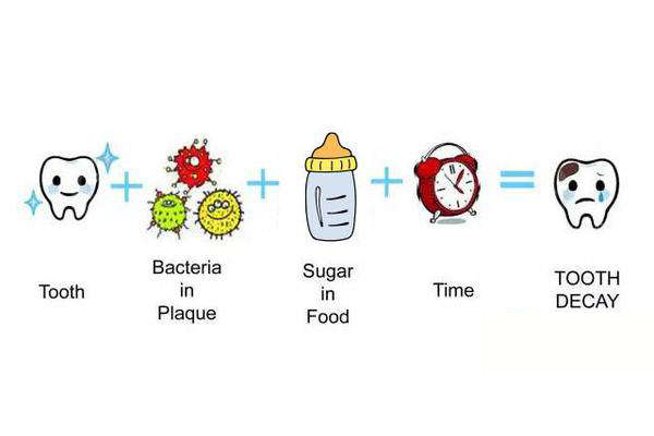在齲齒形成過程中,飲食是細(xì)菌的重要作用物。食物中含有大量的碳水化合物和糖,這些物質(zhì)既供給菌斑中細(xì)菌生活和活動(dòng)能量,又通過細(xì)菌代謝作用使糖酵解產(chǎn)生有機(jī)酸,酸長期滯留在牙齒表面和窩溝中,使釉質(zhì)脫礦破壞,繼之某些細(xì)菌又使蛋白質(zhì)溶解形成齲洞。