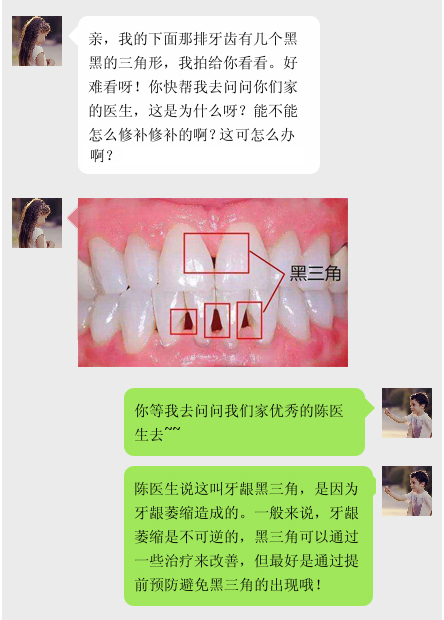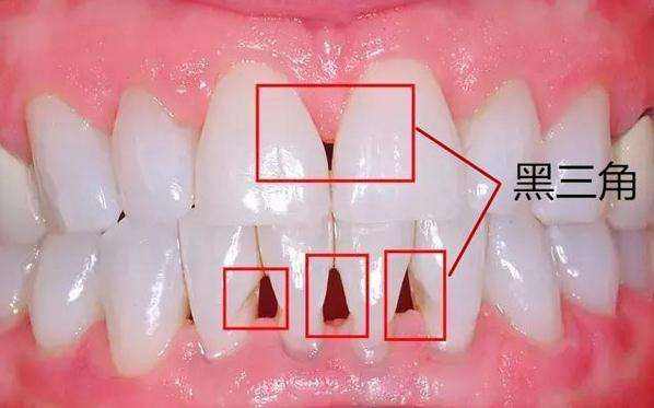 牙齦原本是緊貼在牙齒上面的,當牙齦出現(xiàn)萎縮的現(xiàn)象牙齦不能完全覆蓋兩個牙齒的牙頸部與接觸點之間的間隙時,就會與牙齒形成黑色的三角形的空洞,即“黑三角”,從而影響美觀。