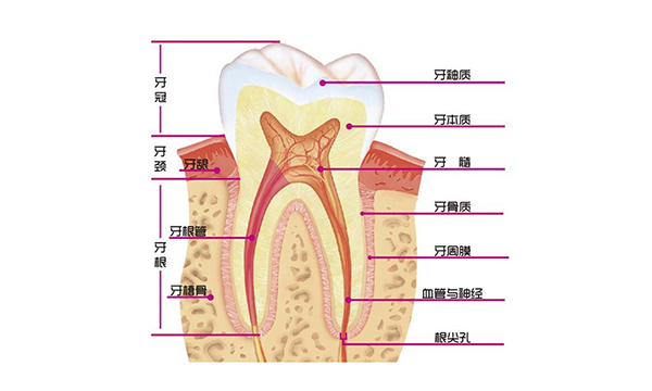 牙髓俗稱“牙神經(jīng)”位于牙齒的牙髓腔中,周圍被礦化程度較高的牙本質(zhì)所包圍,在牙冠_外層還有牙釉質(zhì)覆蓋,在牙齒的根部有牙骨質(zhì)覆蓋,牙髓組織一般通過(guò)狹小的根尖孔與根尖周組織聯(lián)系,牙髓組織中的血管、神經(jīng)、淋巴管都由根尖周組織通過(guò)根尖孔進(jìn)入牙髓腔。